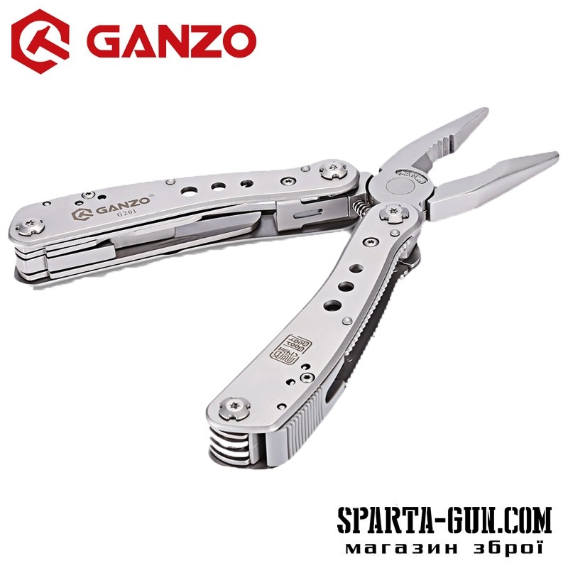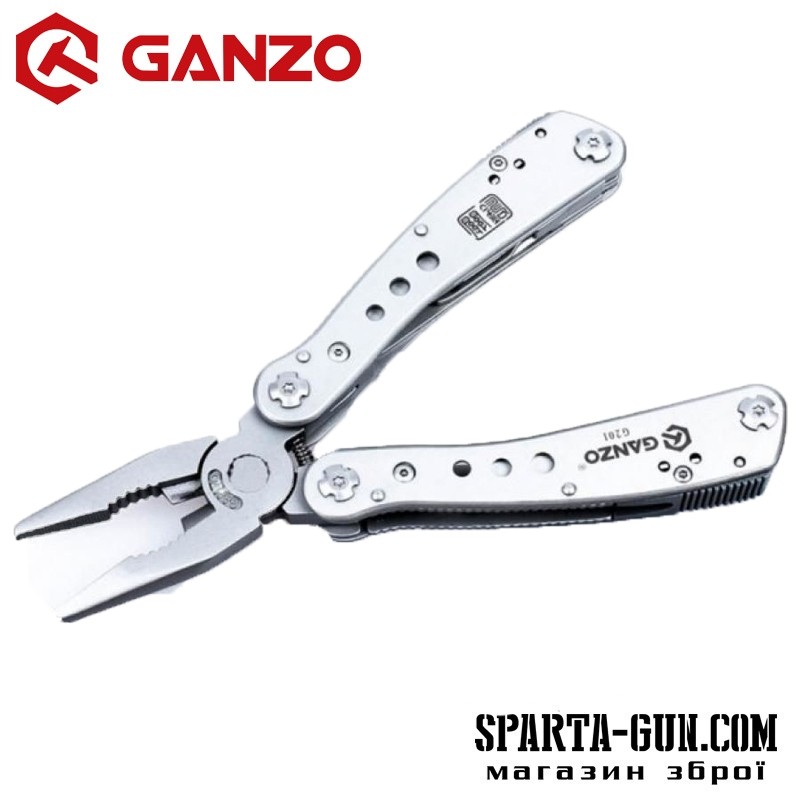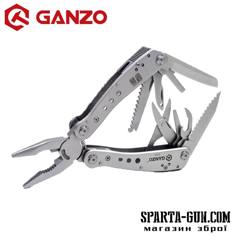 Мультитул Ganzo G201 являє собою практичний інструмент для ремонту будь-якого спорядження або навіть техніки в похідних умовах. Він досить компактний і легкий (265 грам), щоб його було зручно брати з собою в поїздки. У той же час, Ganzo G201 успішно справляється з 25 різними функціями. Головний інструмент в даній моделі - плоскогубці з кусачками і власником круглих предметів. Інші елементи представляють собою компактні інструменти, розміщені всередині рукояток, на зразок швейцарського ножа. Це ножі з гладкою і серрейторной заточкою, пила, відкривачка для консервів, ножиці, шило, дві невеликі плоскі викрутки. Крім того, великий набір змінних наконечників для викрутки винесено в окремий органайзер. Вони закріплюються на тримачі мультитула за допомогою магнітного перехідника.