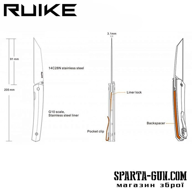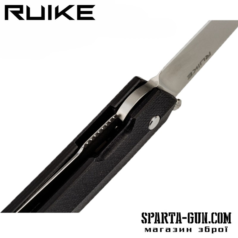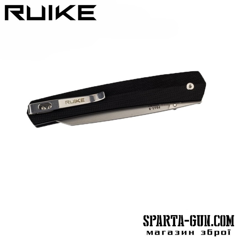 Відкривається ніж Ruike P865-B за допомогою одностороннього шпенька і фіксується замком Liner-lock. Довжина ножа у відкритому вигляді становить 20,5 см, з них на клинок припадають 9,1 см.