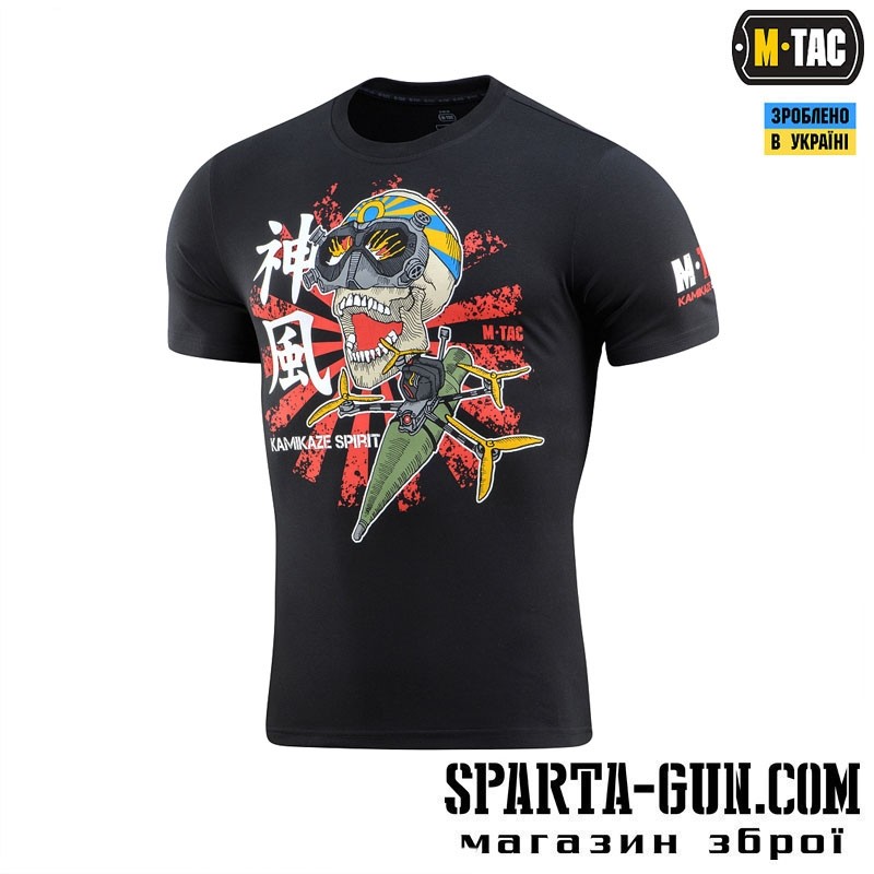 На принті зображений стилізований череп у FPV-окулярах та патріотичній жовто-блакитній пов’язці на тлі "сонячного прапора", відомого в Японії як Хіномару ("круг сонця" або ж "круг вогню"). Ліворуч зображений дрон-камікадзе, оснащений пострілом РПГ, що є одним із поширених та ефективних різновидів його застосування для знищення ворожої техніки. Назва футболки "KAMIKAZE SPIRIT" повністю відображає ідеологію та діяльність операторів FPV дронів, які сьогодні відтворюють давні традиції японських пілотів-камікадзе, але в контексті сучасних реалій.