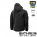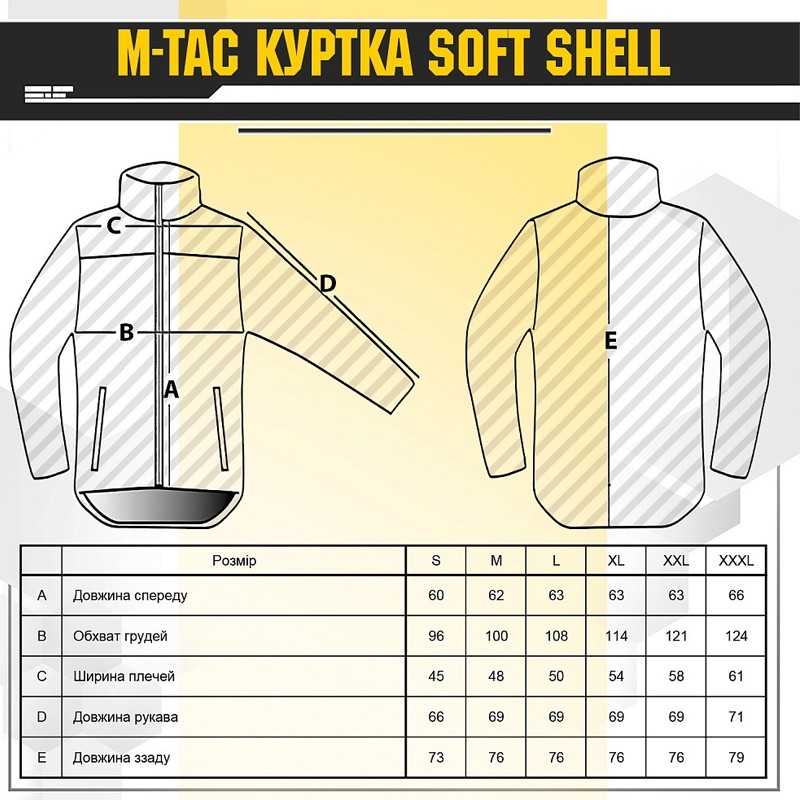 M-TAC куртка Soft Shell з підстібкою виготовлена з мембрани, яка захищає від негоди. У даній моделі виробник додав додатково знімну флісову підстібку, яка кріпиться на блискавці (можна носити як окремий предмет одягу). Усередині тонкий фліс. Динамічний крій не обмежує рухів. Прихований в комірі капюшон має регулювання через кишені на грудях. Має дві ідентифікаційні панелі, які, в залежності від ситуації, можна дістати або заховати. У куртці є одна порожня панель, завдяки якій є можливість вишити або надрукувати потрібні оператору назви. Фахівці бренду M-Tac додали систему, яка дозволить зручно і швидко дістати зброю або інші предмети, котрі знаходяться на поясі. Дана система дозволить одним плавним рухом дістати зброю, електрошокер, або інші аксесуари, що помітно впливає на час реакції в небезпечних випадках. Передня блискавка виготовлена компанією YKK. Блискавка якісна і виконує свою функцію без будь-яких видимих проблем.