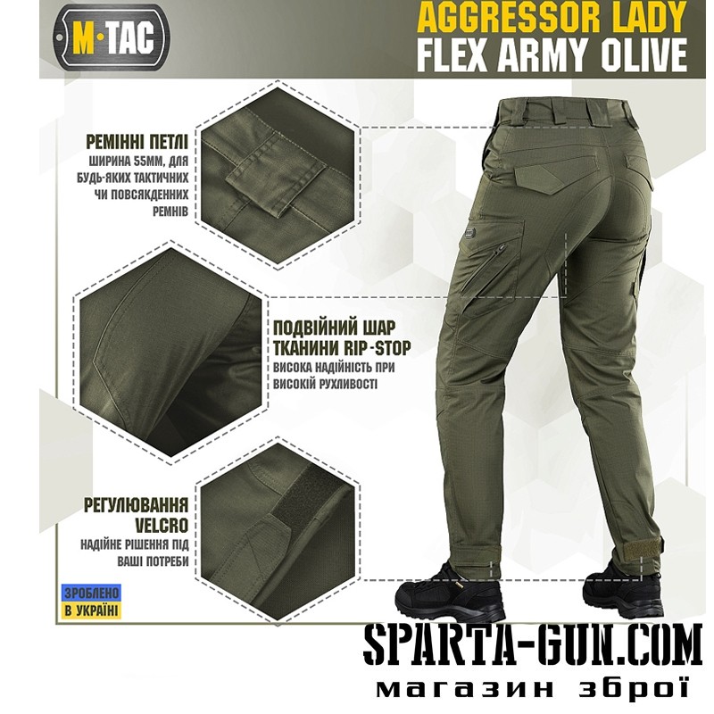 M-Tac штани Aggressor Lady Flex ви можете використовувати як для тренувань, стрільбища, роботи, так і для ділової подорожі або прогулянки. Вітчизняний бренд M-Tac намагається вносити інноваційні технології на ринок. Пошиті штани з легкої, однотонної тканини ріп-стоп, з водо- і брудозахисним просоченням Teflon. Тканина з вмістом поліестеру і бавовни приємна до тіла, добре тримає колір і відрізняється високою міцністю. Основним завданням дизайнерів брюк було зберегти комфорт рухів, і з цим вони впоралися на всі сто відсотків – штани створюють відчуття легкості, не сковують рухів і виглядають стильно. Зручні широкі кишені з посиленими вставками. Брюки розраховані на носіння з ременем шириною до 5.5 сантиметрів. Спереду на кріпленнях для ременя нашиті пряжки для фіксування чого завгодно (за допомогою карабінів). Якісна фурнітура від компанії YKK. Добре підібрані за розміром брюки настільки зручно сидять, що створюється враження, ніби одягнений в спортивні штани.