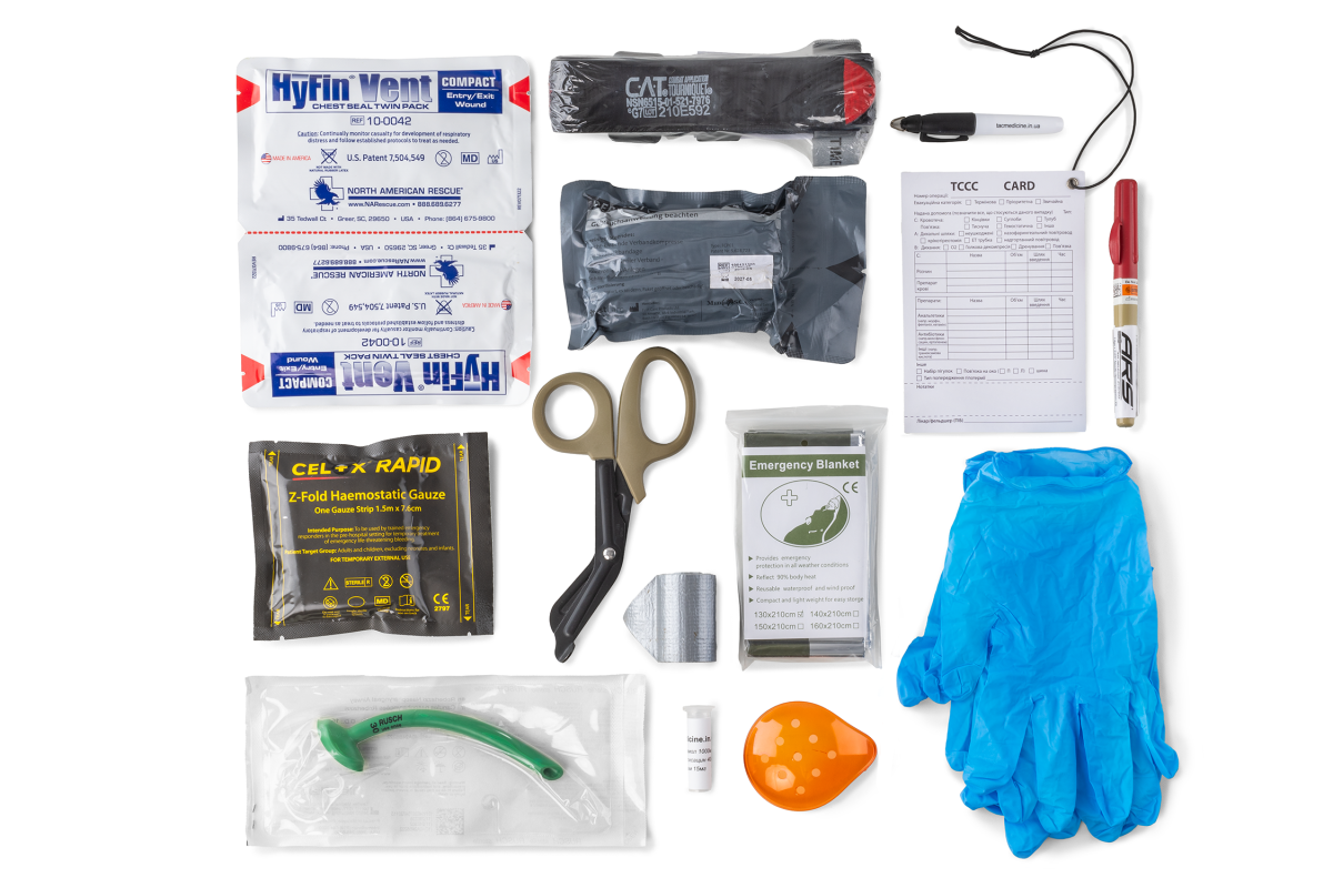 Комплект розроблений для надання індивідуальної допомоги по алгоритму MARCH.Вміст комплекту вміщається в:1. Аптечний підсумок 9Line U-WIN AGILE2. Тунельний аптечний підсумок U-WIN PRO3. Підсумок аптечний стандартний U-WINПідсумки в комплект не входять і доступні до замовлення окремо.В комплект входить:1. Турнікет C.A.T. Gen72. Оклюзійна пов’язка (наліпка) для герметизації грудної клітки NAR Hyfin Vent Chest Seal Twin Pack COMPACT (2 шт.) 3. Гемостатичний бинт Celox Rapid4. Декомпресійна голка ARS 14G 5. Назофарінгальна трубка Rusch 28 FR — 117 мм з лубрикантом6. Ізраїльський бандаж PerSysMedical Розмір 47. Армований скотч8. Термоковдра9. Ножиці для розрізання одягу і взуття атравматтчні Black Front Standart 10. Маркер перманентний11. Рукавички медичні одноразові Розмір L (2 пари)12. Картка пораненого