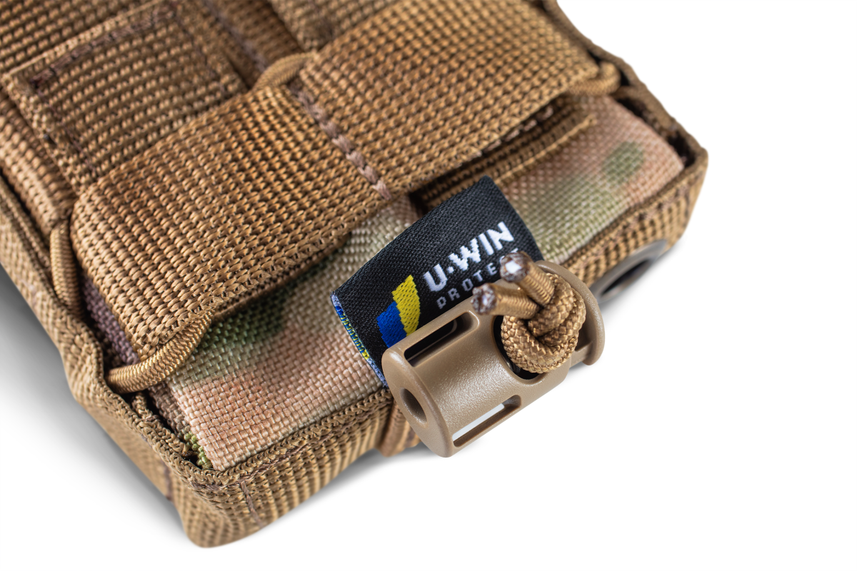 Підсумок під AR U-WIN призначений для легкого і оперативного доступу до магазину AR без зайвих рухів і звуків.Магазин не випадає з підсумку навіть підчас інтенсивного бігу чи стрибків.Підсумок виконаний з міцної зносостійкої тканини та високоякісних поліамідних строп, які забезпечують надійне кріплення до будь-якого MOLLE-інтерфейсу.Шви виконані армованими нитками Tytan з зигзагоподібними закріпками на MOLLE-інтерфейсі.Підсумок проплетений якісним шок-кордом з поліаміду, який з часом не змінює своїх властивостей. При необхідності більш плотної фіксації, шок-корд можна легко підтягнути і зафіксувати спеціальним фіксатором.Всередині підсумку є спеціальні пластикові вставки, які разом з еластичним шок-кордом міцно утримують магазин, не перешкоджаючи вільному доступу до нього.На дні підсумку встановлений люверс для відводу води і бруду.Бокові частини підсумку виконані з поліамідної стропи, тож, на відміну від підсумків з пластиковими боковими частинами, при необхідності лягти на порожні підсумки, вони не будуть заважати.Наявність зовнішнього MOLLE-інтерфейсу дозволяє розміщувати підсумки один на одному, тим саме утворюючи спарений оперативний підсумок під два магазини з перегородкою між ними.Матеріали:- Оригінальна Cordura 1000D (Brookwood,